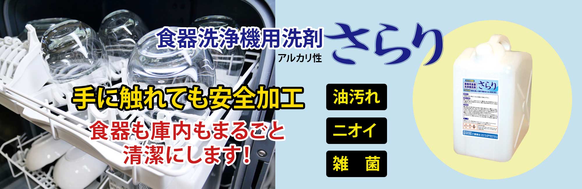 業務用の食洗機用洗剤は、本来、肌へのやさしさよりも洗浄力を優先しています。油汚れなどを完全に落とすためです。市販の商品は洗浄力が強い反面、手荒れなどになりますが、『さらり』は、水本来の力を高めて独自製造していますので、優れた洗浄力と肌や素材への優しさも両立しています。